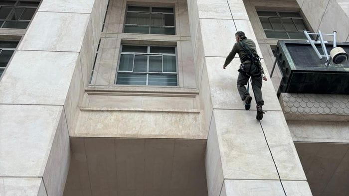 LA CURIOSITÀ. Passanti stupiti e meravigliati per un uomo che si arrampicava sabato 14 febbraio con una fune sul Palazzo della Libertà a Bergamo.