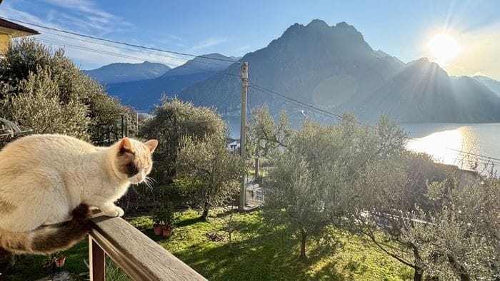 Il gatto Iride, Riva di Solto e la vista sul lago d’Iseo con la Corna Trentapassi. La foto è di Tiziana Rodari