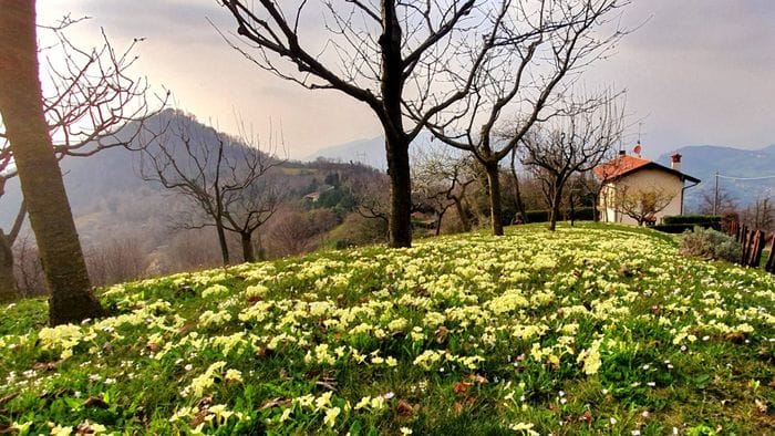Fioritura di primule sul Canto a Sotto il Monte. La foto del giorno è di Wilma Mantecca.