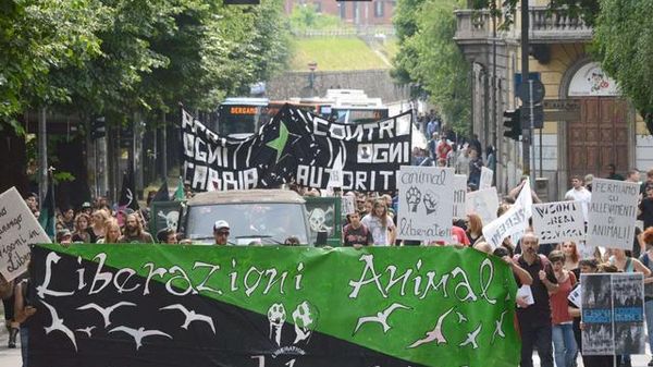 Sono un'ottantina i partecipanti al corteo organizzato nel pomeriggio di sabato 8 giugno in centro a Bergamo per manifestare contro gli allevamenti di visoni.