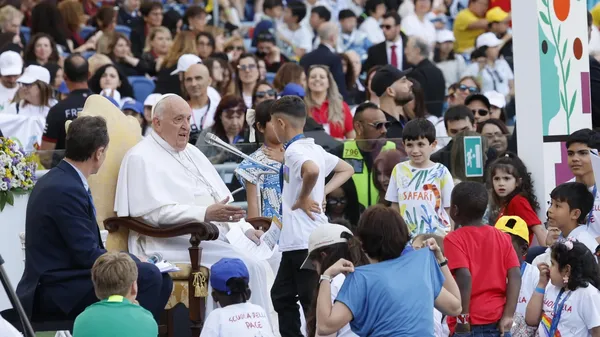 ITALIA. Nello stadio Olimpico di Roma riempito da oltre 100mila bambini, sacerdoti ed educatori di 101 nazionalità diverse, Papa Francesco, «nonno del mondo», come lo definisce il «nonno d’Italia» Lino Banfi, risponde alla domanda di uno di loro su come si fa la pace.