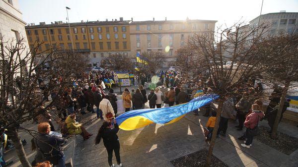 «Chiudete il cielo per salvare l’Ucraina». Questa la richiesta, gridata a gran voce e scritta su cartelli, che le ucraine e gli ucraini hanno ripetuto domenica pomeriggio 7 marzo in largo Porta Nuova, a Bergamo, durante il presidio promosso dall’associazione Zlaghoda che ha radunato oltre 200 persone.
