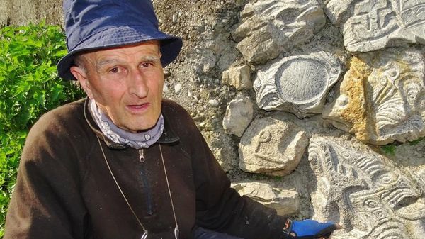 Via Piazzo è una piccola strada che si snoda ai piedi del monte Cereto, appena fuori dal caos cittadino di Albino. Si narra che, ai margini del bosco, viva un’artista che dialoga con le pietre, che dà loro un’anima. Lo si scorge già da lontano, seduto su di un piccolo sgabello davanti a un lungo muro.