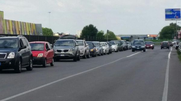 In via Aeroporto domenica mattina 21 giugno una fila di auto in divieto.