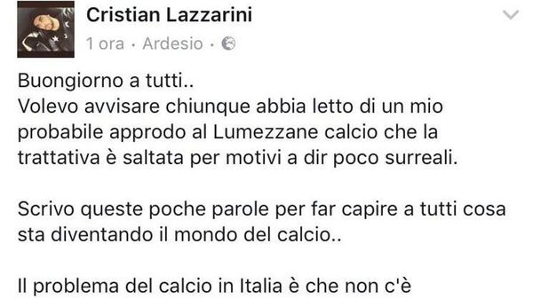 Si tratta di Cristian Lazzarini di Ardesio che su Facebook si sfoga e denuncia le distorsioni del calcio. Il suo trasferimento al Lumezzane sarebbe saltato a causa dei «soliti raccomandati».