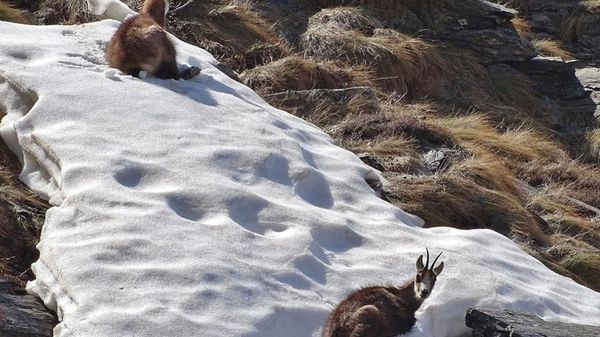 Il rialzo termico si fa sentire anche in montagna: e persino i camosci, dopo aver brucato l’erba ancora secca dei pascoli, cercano un po’ di refrigerio.