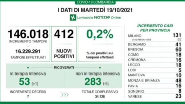 La provincia più colpita è quella di Milano, dove i contagiati odierni di Covid sono 131, di cui 52 a Milano città.