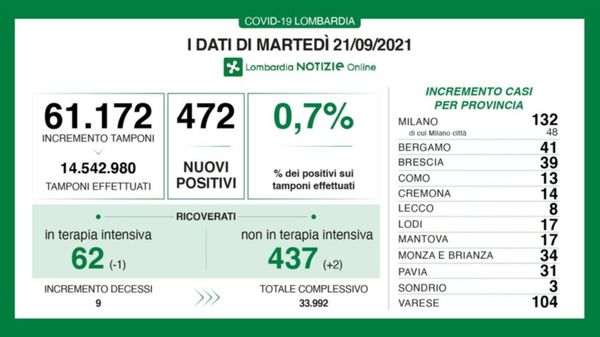 Sono 3.804 i positivi ai test Covid individuati nelle ultime 24 ore, secondo i dati del Ministero della Salute diffusi giovedì 30 settembre. Mercoledì erano stati 3.212. Sono invece 51 le vittime in un giorno (mercoledì erano state 63).