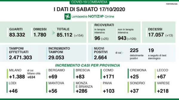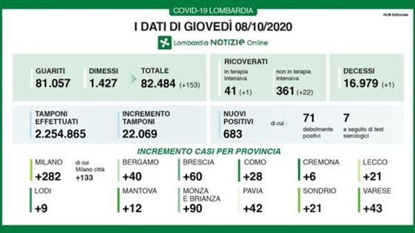 L’aggiornamento della diffusione della pandemia con i dati di mercoledì 14 ottobre in Lombardia.