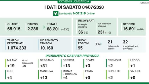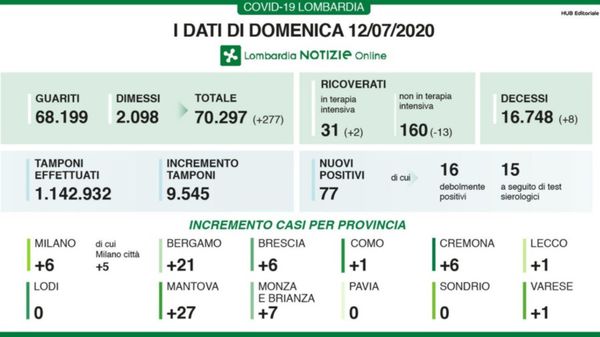 Domenica 12 luglio una novità importante: nessun contagio a Lodi, Pavia e Sondrio. A Bergamo 21 nuovi positivi.