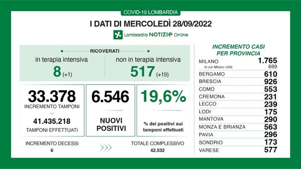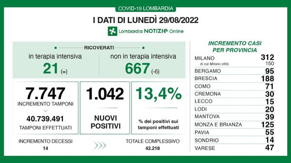 I dati. Stabili i ricoverati nelle terapie intensive (21), continuano a diminuire i ricoverati nei reparti (-6). A fronte di 7.747 tamponi effettuati, sono 1.042 i nuovi positivi (13,4%) come indicato da Regione Lombardia nella giornata di lunedì 29 agosto.