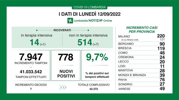 I dati. A fronte di 27.903 tamponi effettuati sono 3.525 i nuovi positivi al Covid, nelle ultime 24 ore in Lombardia, con un tasso di positività in discesa al 12,6% mercoledì 21 settembre (14,6% martedì).