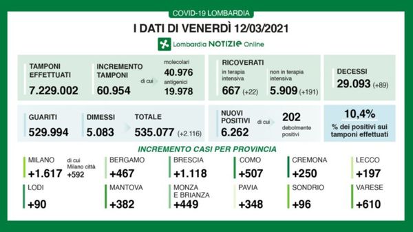 I dati regionali aggiornati a venerdì 12 marzo. A fronte di 60.954 tamponi effettuati, sono 6.262 i nuovi positivi sul territorio lombardo. Rapporto positivi/tamponi al 10,4%. Aumentano ancora i ricoveri. Le vittime sono 89.