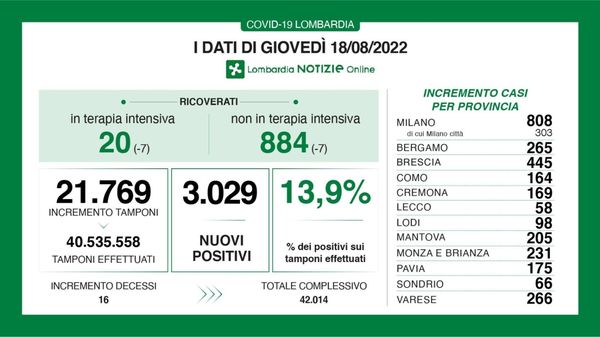 I dati. Diminuiscono i ricoverati nelle terapie intensive (-7) e nei reparti (-7). A fronte di 21.769 tamponi effettuati, sono 3.029 i nuovi positivi (13,9%).