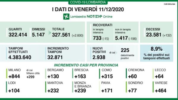 Diminuiscono i ricoverati in terapia intensiva (-15) e nei reparti (-196) nella giornata di venerdì 11 dicembre secondo il report di Regione Lombardia. Il numero dei tamponi effettuati è 32.871 e 2.938 sono i nuovi positivi (8,9%). I guariti/dimessi sono 2.600.