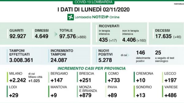 In Lombardia nella giornata di lunedì 2 novembre sono 5.278 i positivi, con 24.087 tamponi effettuati, per una percentuale pari al 21,9%.