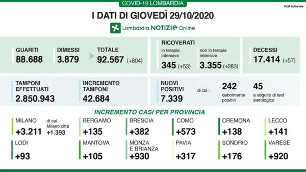 Sono 7.339 i positivi di giovedì 29 ottobre con un numero molto alto di tamponi effettuati (42.684), per una percentuale in lieve calo, rispetto a mercoledì 28 ottobre, pari al 17,1%. I guariti e dimessi sono +804.