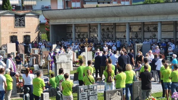 I volontari dell’oratorio riuniti intorno ai famigliari per l’ultimo saluto a Cristian Persico. Il suono dei baghèt e le preghiere. Foto e video.