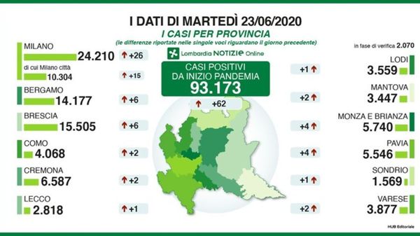 L’assessore al Welfare, Giulio Gallera: «Dei 62 casi positivi di oggi, 23 sono riferiti a tamponi effettuati a seguito di una positività riscontrata al test sierologico». I dati regionali di martedì 23 giugno.