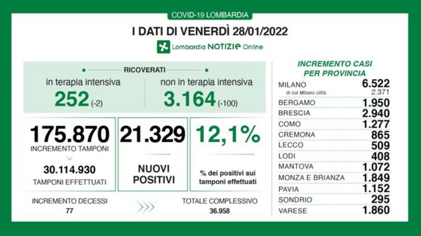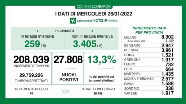 I dati di mercoledì 26 gennaio nel report della Regione Lombardia. Ancora in calo i ricoverati nelle terapie intensive (-5) e nei reparti ordinari (-6). I decessi sul territorio regionale sono 74. Effettuati oltre 208 mila tamponi.