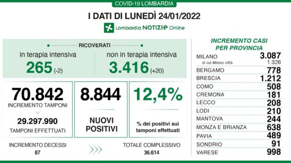 I dati di lunedì 24 gennaio in lombardia. effettuati 70.842 tamponi, i positivi sono 8.844 (12,4%).