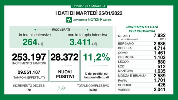 I dati nel report di martedì 25 gennaio. Effettuati oltre 253 mila tamponi, tasso di positività all’11,2%. I decessi sono 70. Lieve flessione dei ricoveri: -1 in terapia intensiva, - 5 nei reparti ordinari.