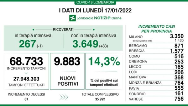 I dati di lunedì 17 gennaio in lombardia. effettuati 68.733 tamponi, i positivi sono 9.883 (14,3%).
