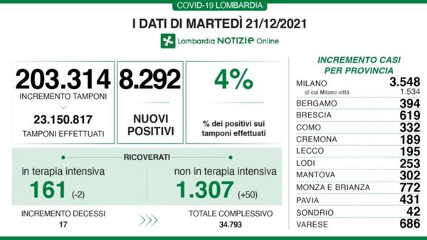 I dati di martedì 21 dicembre in lombardia. effettuati 203.314 tamponi, i positivi sono 8.292 (4%).