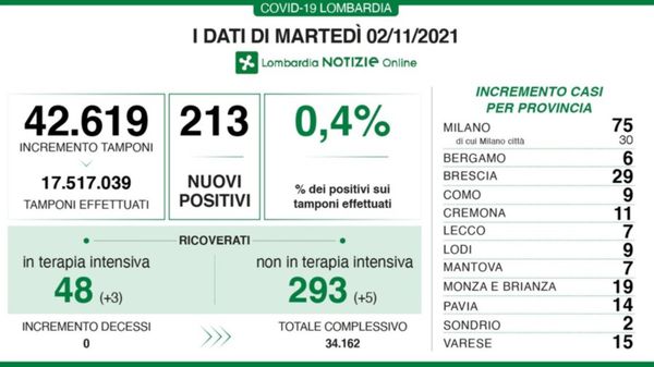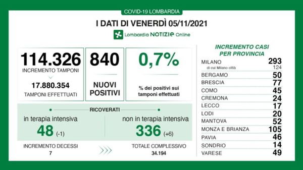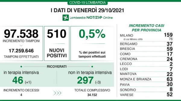Ecco i dati della cabina di regia di Regione Lombardia per la giornata di venerdì 29 ottobre.