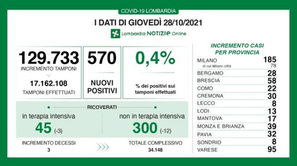 I dati di giovedì 28 ottobre nel report della Regione. Diminuiscono i ricoverati nelle terapie intensive lombarde (-3) e nei reparti (-12). I decessi sul territorio lombardo sono 3.
