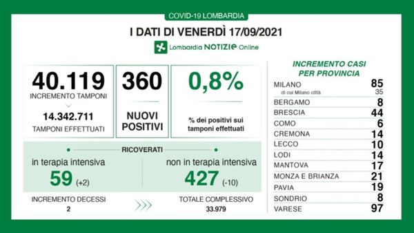 I dati di venerdì 17 settembre nel report della Regione. Tasso di positività allo 0,8%. Le vittime sono due.
