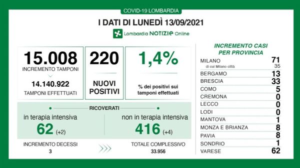 L’aggiornamento nel report regionale di lunedì 13 settembre. Tasso di positività all’1,4%. Nessun nuovo caso a Cremona, Lodi e Lecco.