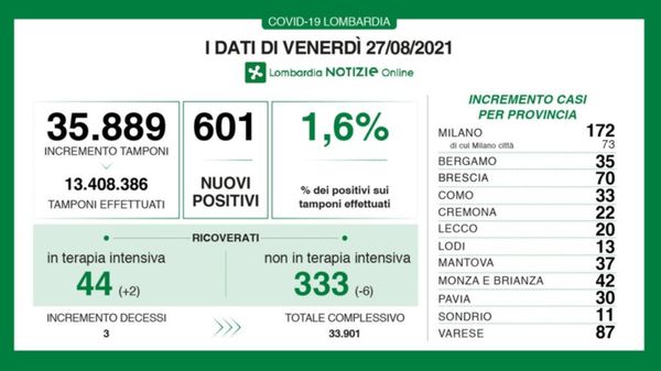 Sono 5.959 i positivi ai test Covid individuati nelle ultime 24 ore, secondo i dati del Ministero della Salute diffusi nel pomeriggio di domenica 29 agosto. Sabato 28 agosto erano stati 6.860. Sono invece 37 le vittime in un giorno, rispetto alle 54 di sabato.