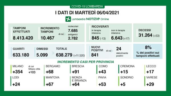 I dati regionali nel report di martedì 6 aprile. I tamponi effettuati sono 10.567. Il tasso di positività è all’8%. Le vittime sono 53. Il presidente della Regione: «Spero che venerdì si potrà chiedere di poter rientrare nella zona arancione».