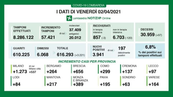 I dati nazionali nel report di sabato 3 aprile del ministero della Salute. Il tasso di positività è al 5,9%.