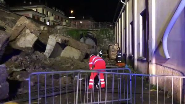 Mezza carreggiata di via Locatelli, a Piazza Brembana, scivolata all’improvviso di otto metri. Trecento metri cubi di terra e cemento su via Tiro a Segno. In azione anche i nuclei cinofili: nessun ferito.