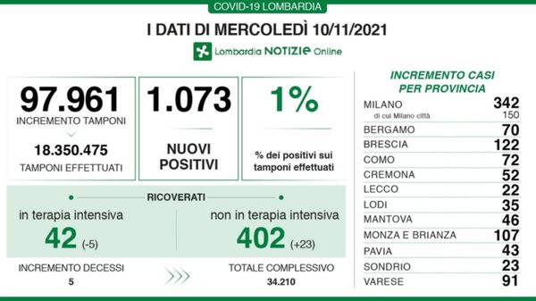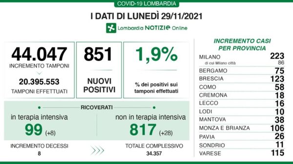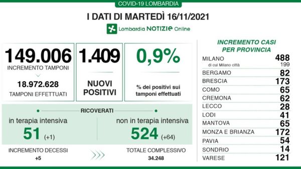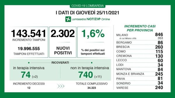 I dati di giovedì 18 novembre in Lombardia.