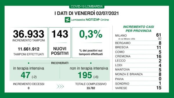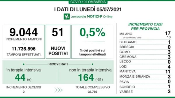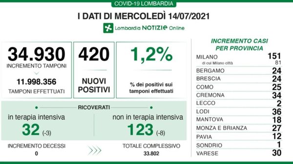 I dati aggiornati in Lombardia a martedì 13 luglio.