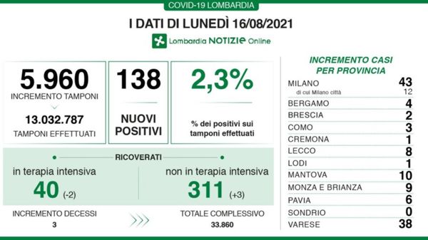 I dati di lunedì 16 agosto in lombardia. Effettuati 5.960 tamponi, i positivi sono 138 (2,3%).