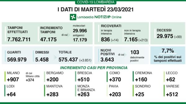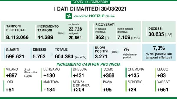 A fronte di 44.289 tamponi effettuati, sono 3.271 i nuovi positivi (7,3%) nella giornata di martedì 30 marzo. I guariti/dimessi sono 2.469. I dati di Regione Lombardia.