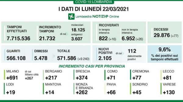 A fronte di 21.732 tamponi effettuati, sono 2.105 i nuovi positivi (9,6%) in Lombardia. I guariti/dimessi sono 9.240. Ecco i dati forniti dalla Regione nella giornata di lunedì 22 marzo.