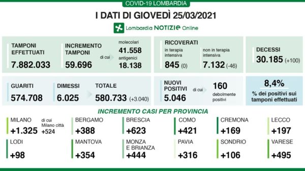 Tutti i dati dello sviluppo della pandemia nella nostra regione aggiornati a giovedì 25 marzo. La situazione in Italia: ancora 460 decessi.