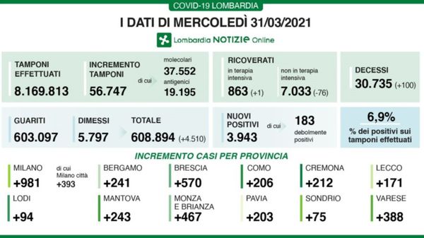 A fronte di 56.747 tamponi effettuati, sono 3.943 i nuovi positivi (6,9%). I guariti/dimessi sono 4.510. Ecco i dati diffusi da Regione Lombardia nella giornata di mercoledì 31 marzo.