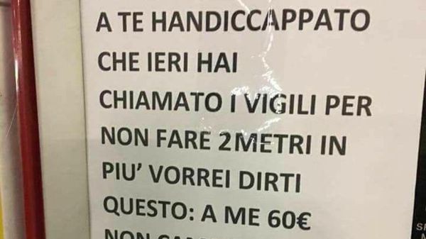 Ha preso una multa per aver parcheggiato negli spazi riservati ai disabili e si è pure permesso di lasciare un messaggio (sgrammaticato) di insulti all’indirizzo della persona cui aveva rubato il posto.