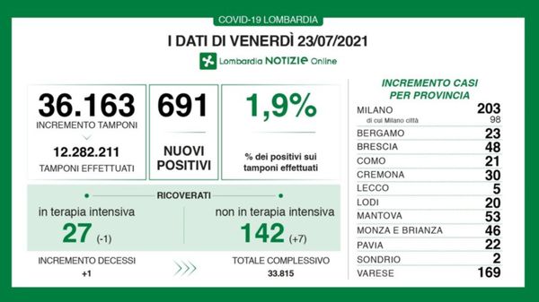 I dati di venerdì 23 luglio nel report della Regione. Il tasso di positività è all’1,9%.