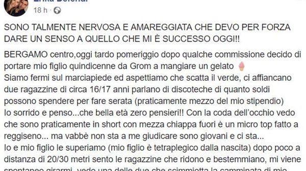 Più che un post una lezione di vita, quella di Erika Defendi e di suo figlio disabile dalla nascita, derisi in centro a Bergamo da due ragazzine forse ancora minorenni.