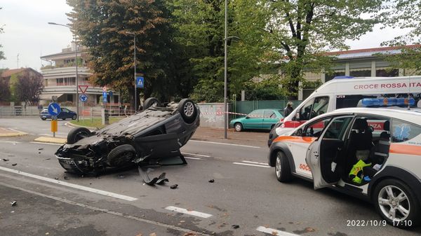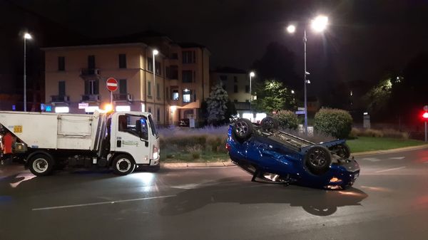 L’incidente. Ribaltamento in largo Tironi a Bergamo nella serata di mercoledì 21 settembre: due auto si sono scontrate probabilmente per una mancata precedenza.
