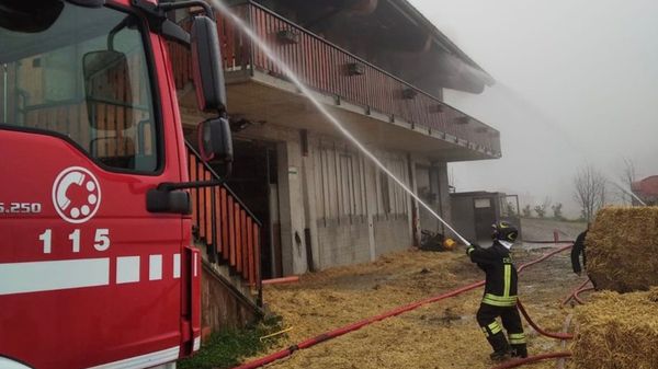 Bruciato il tetto e tutto il fieno: in azione i Vigili del fuoco di Clusone, di Zogno e i volontari di Gazzaniga.