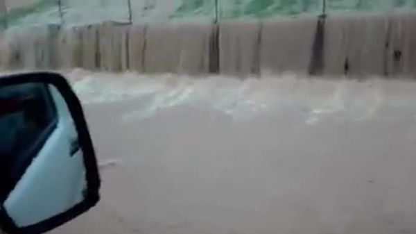 Un fiume d’acqua e fango porta via una campana della raccolta del vetro