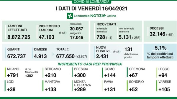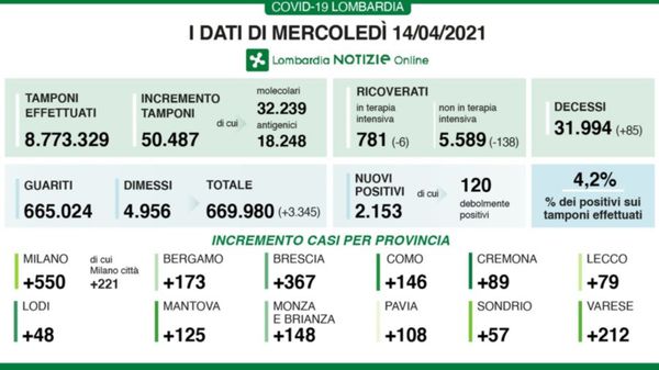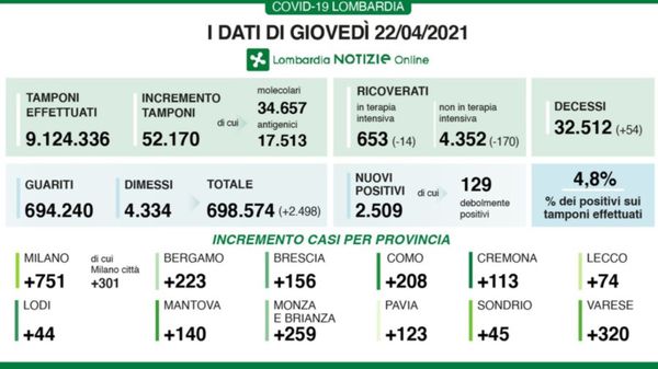 Continuano a diminuire i ricoverati nelle terapie intensive (-14) e nei reparti (-170). A fronte di 52.170 tamponi effettuati, sono 2.509 i nuovi positivi (4,8%). I guariti/dimessi sono 2.498.